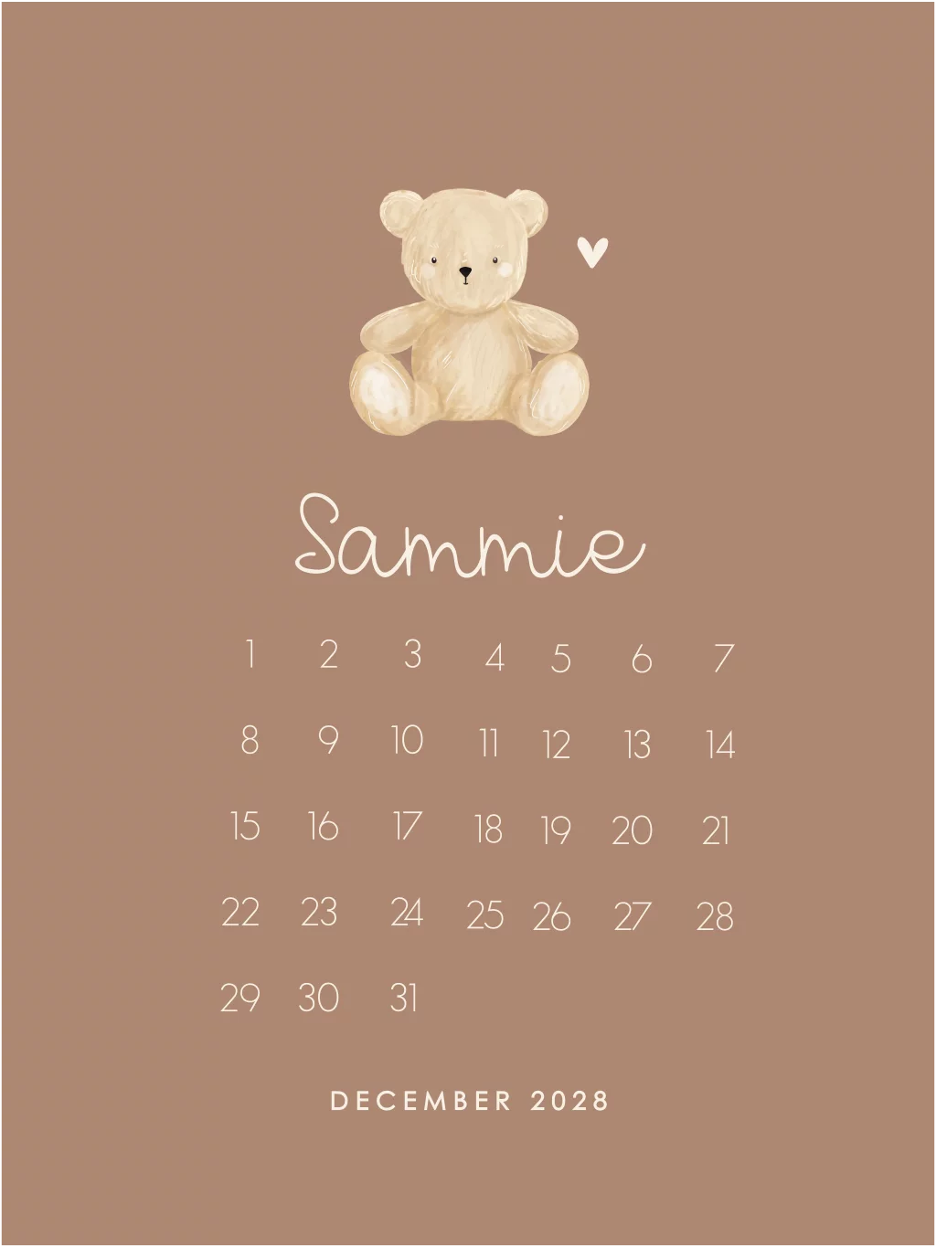Dit is een mooie poster voor de kinderkamer. Op de poster zie je een getekende beer met kalender. Omcirkel de datum waarop jouw kindje is geboren. De poster is naar wens aan te passen in onze online editor.