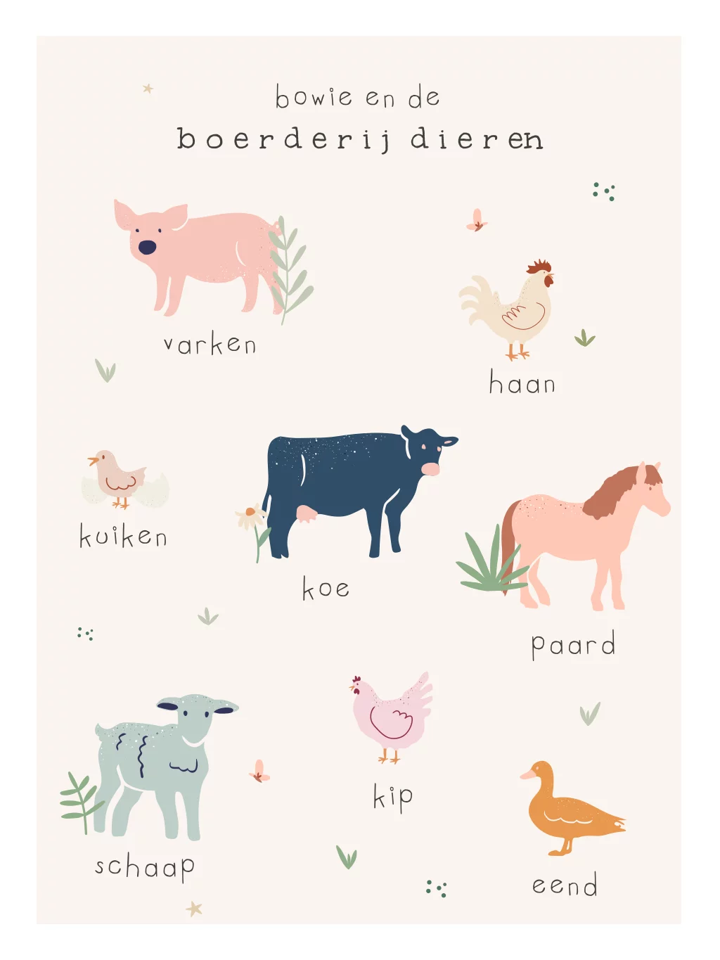 Vrolijk de kinderkamer op met deze mooie poster! Op de poster zie je tekeningen van verschillende boerderijdieren. De poster is naar wens aan te passen in onze online opmaaktool.