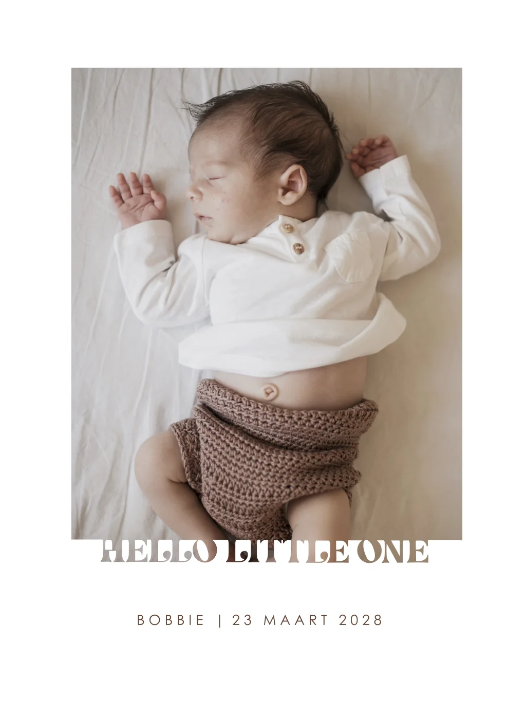 Maak de kinderkamer extra persoonlijk met deze poster. Op de poster kan je een foto van je eigen kindje plaatsen. Onder de foto lees je de tekst "Hello little one" met de naam en geboortedatum. De poster is naar wens aan te passen in onze online opmaaktool.