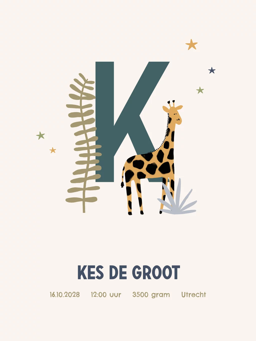 Een avontuurlijke poster voor op het kinderkamertje. Bij de initiaal van het kleintje is een giraffe met takjes en sterretjes te zien. De geboortegegevens maken deze poster extra persoonlijk. In onze online opmaaktool kan de poster naar wens aangepast worden.
