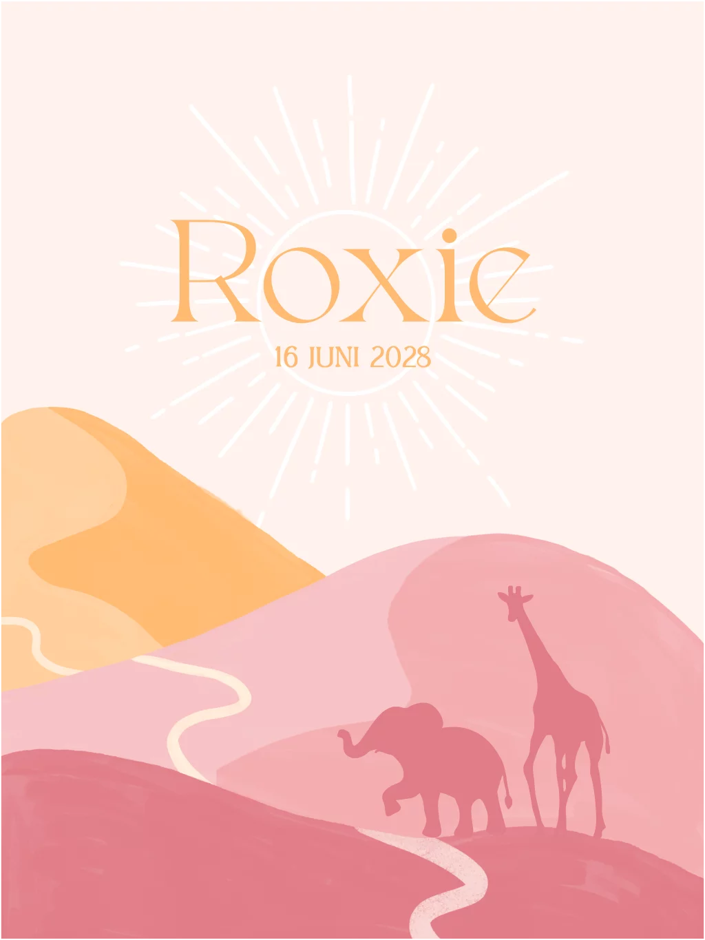 Een avontuurlijke poster voor op het kinderkamertje. Op de poster is een abstract landschap te zien met de silhouetten van een olifant en giraffe. De naam en geboortedatum geven deze poster een persoonlijke touch. In onze online opmaaktool kan de poster naar wens aangepast worden.