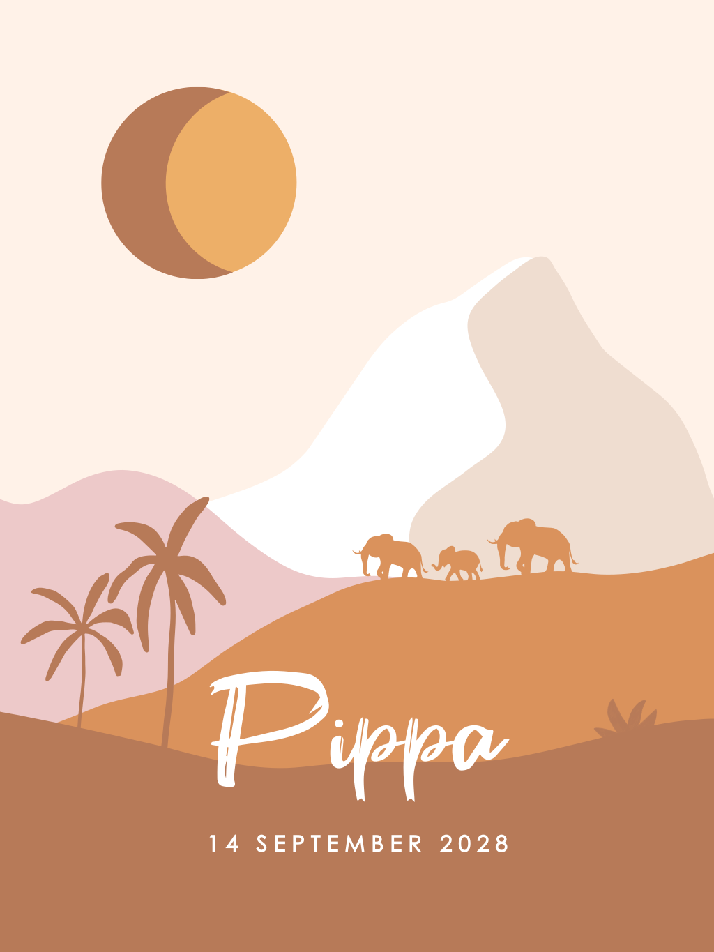 Geboorteposter met landschap, olifantjes en geboortegegevens