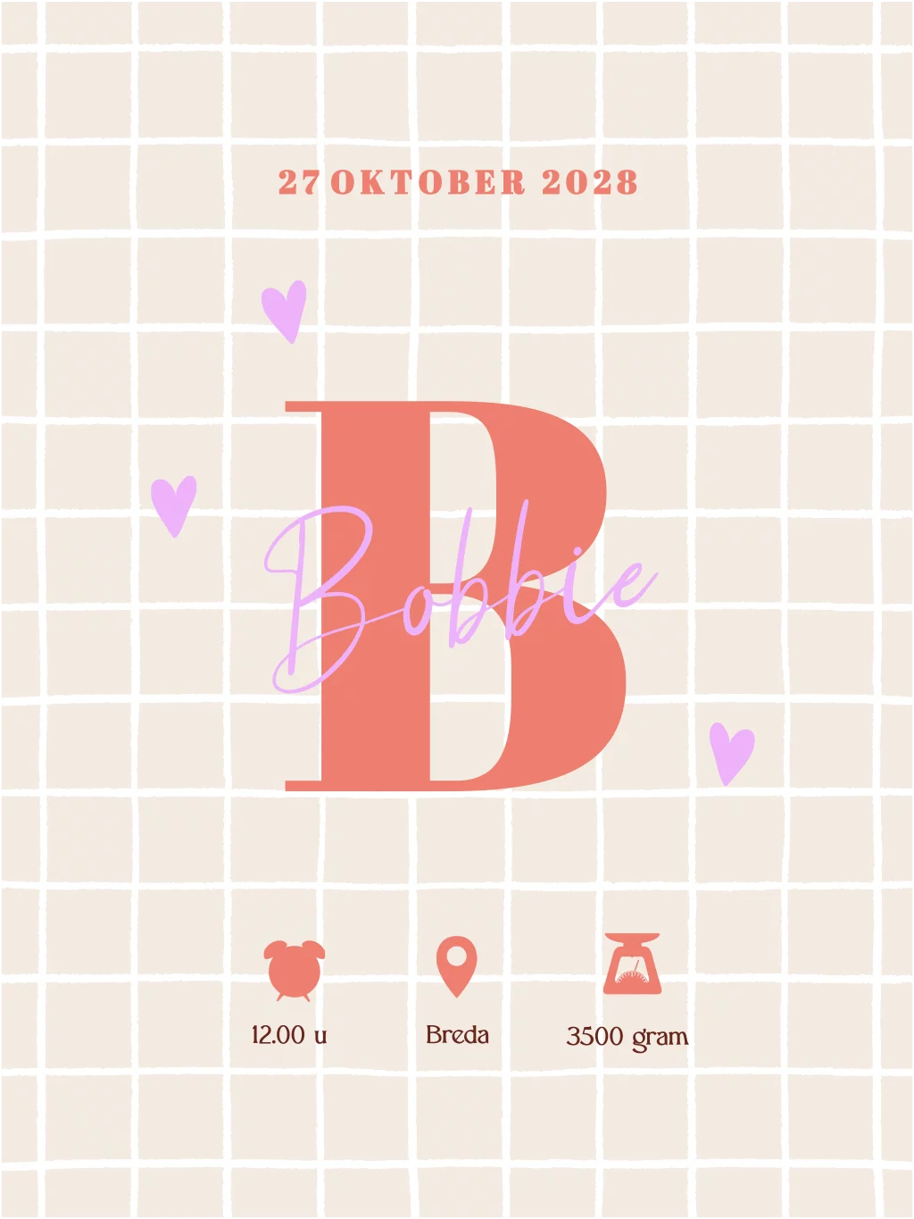 Een speelse poster voor op het kinderkamertje. De poster heeft een ruitpatroon met hartjes en de geboortegegevens van het kleintje. In onze online opmaaktool kan de poster naar wens aangepast worden.