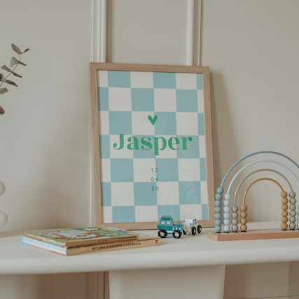 Een mooie poster voor op het kinderkamertje. De poster heeft een ruitpatroon met de naam van het kleintje, een hartje en de geboortedatum. In onze online opmaaktool kan de poster naar wens aangepast worden.