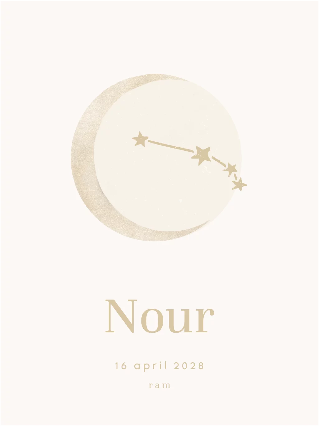 Een mooie poster voor op de baby- of kinderkamertje. Op de poster staat de illustratie van een maan met daarin het sterrenbeeld ram. Daaronder kun je zelf heel gemakkelijk de naam en geboortedatum van je kind toevoegen. Dit geeft de poster een persoonlijke touch. In onze online opmaaktool kan het design naar wens aangepast worden.