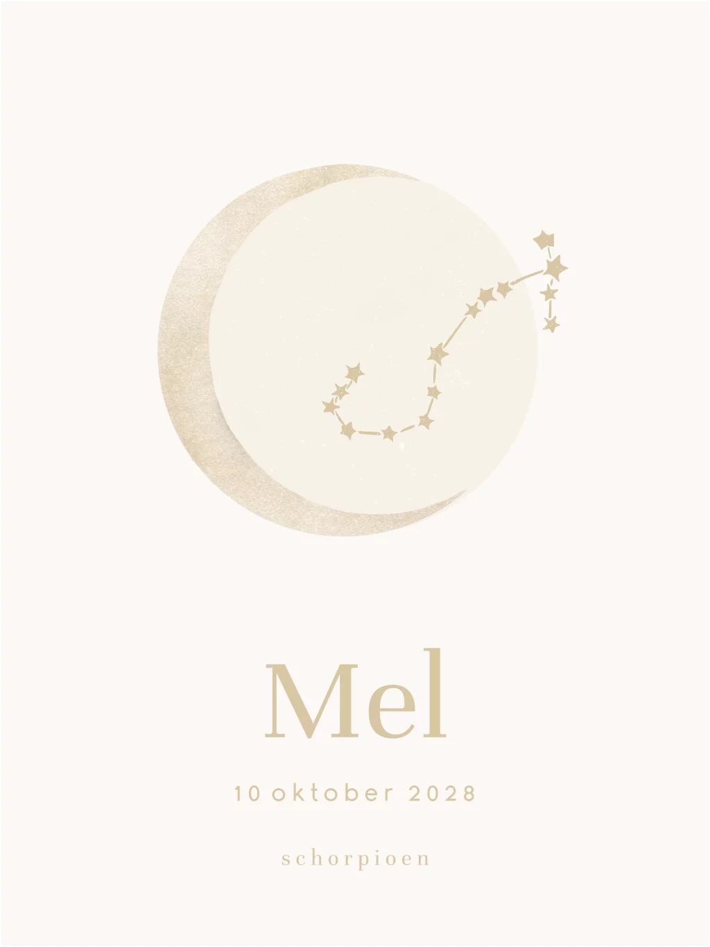 Een mooie poster voor op de baby- of kinderkamertje. Op de poster staat de illustratie van een maan met daarin het sterrenbeeld schorpioen. Daaronder kun je zelf heel gemakkelijk de naam en geboortedatum van je kind toevoegen. Dit geeft de poster een persoonlijke touch. In onze online opmaaktool kan het design naar wens aangepast worden.