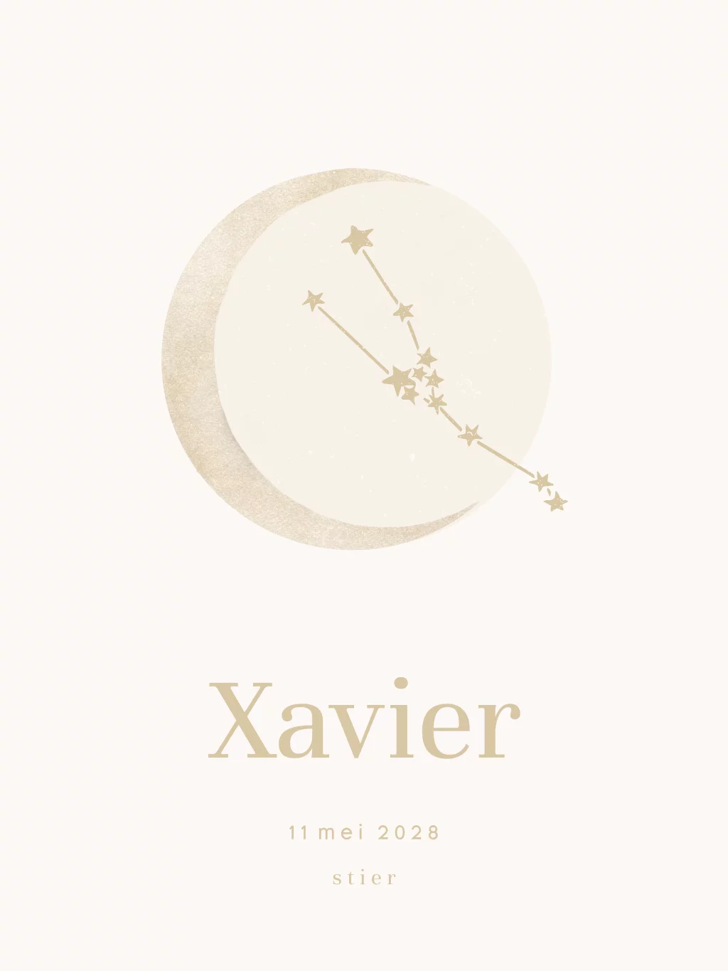 Een mooie poster voor op de baby- of kinderkamertje. Op de poster staat de illustratie van een maan met daarin het sterrenbeeld stier. Daaronder kun je zelf heel gemakkelijk de naam en geboortedatum van je kind toevoegen. Dit geeft de poster een persoonlijke touch. In onze online opmaaktool kan het design naar wens aangepast worden.