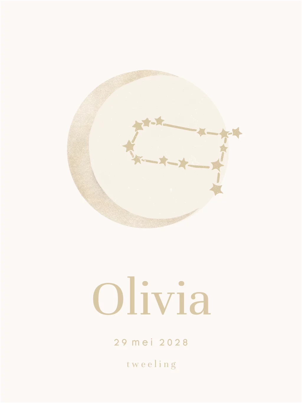 Een mooie poster voor op de baby- of kinderkamertje. Op de poster staat de illustratie van een maan met daarin het sterrenbeeld tweeling. Daaronder kun je zelf heel gemakkelijk de naam en geboortedatum van je kind toevoegen. Dit geeft de poster een persoonlijke touch. In onze online opmaaktool kan het design naar wens aangepast worden.