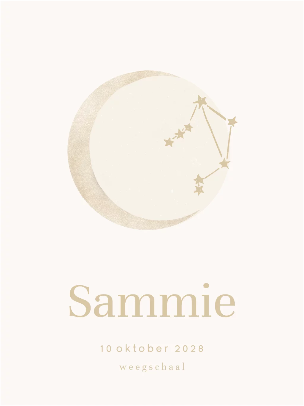 Een mooie poster voor op de baby- of kinderkamertje. Op de poster staat de illustratie van een maan met daarin het sterrenbeeld weegschaal. Daaronder kun je zelf heel gemakkelijk de naam en geboortedatum van je kind toevoegen. Dit geeft de poster een persoonlijke touch. In onze online opmaaktool kan het design naar wens aangepast worden.