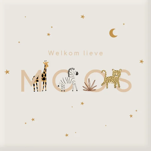 Een geboortetegeltje voor jouw kindje of als kraamcadeau. De tegel heeft een beige achtergrond met daarop de naam een giraf, zebra en een panter. Pas de tegel zelf volledig naar wens aan.