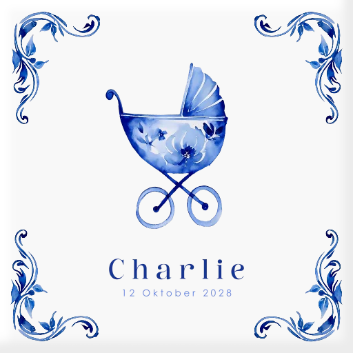 Geboortetegel in het Delfts blauw met kinderwagen en naam