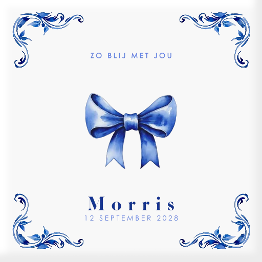 Dit is een mooie geboortetegel voor je eigen kleintje of om cadeau te doen. De tegel heeft een Delfts blauw thema met strik en naam. Pas de tegel helemaal naar wens aan in onze online opmaaktool.