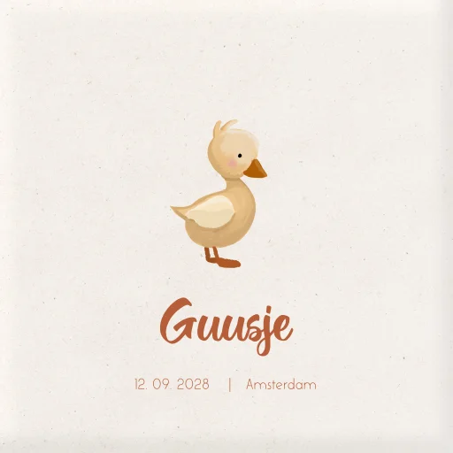 Wat een schattig geboortetegeltje. Het tegeltje heeft een crèmekleurige achtergrond met daarop een lieve illustratie van een eendje. Onder het eendje is er ruimte voor de naam, geboortedatum en geboorteplaats. Het tegeltje is naar wens aan te passen.