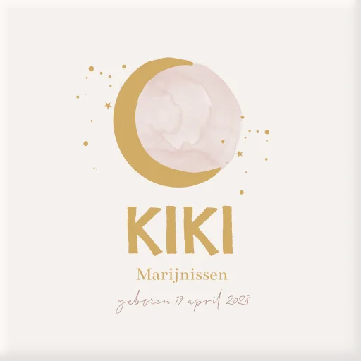 Een dromerig geboortetegeltje voor jouw kindje of als kraamcadeau. De tegel heeft een crèmekleurige achtergrond. Daarop zie je de illustratie van een maan, naam en geboortedatum. Pas de tegel zelf volledig naar wens aan in onze online opmaaktool.