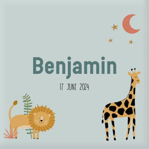 Een stoere geboortetegel voor jouw kindje of als kraamcadeau. Deze tegel heeft een lichtgroene achtergrond met daarop de illustraties van verschillende jungledieren. De naam en geboortedatum geven deze tegel een persoonlijke touch. De tegel is volledig naar wens aan te passen in onze online opmaaktool.