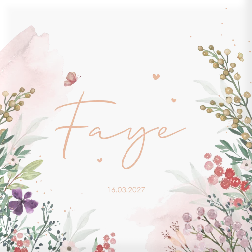 Een romantisch geboortetegeltje voor jouw kindje of als kraamcadeau. Dit tegeltje heeft een roze watercolour achtergrond met daarop verschillende bloementjes en takjes. Pas de tegel volledig naar wens aan.