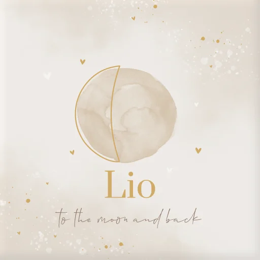 Een dromerig geboortetegeltje voor jouw kindje of als kraamcadeau. De tegel heeft een lichte watercolour achtergrond. Op het tegeltje staat de illustratie van een maan met kleine sterren en daaronder de naam. Pas de tegel zelf volledig naar wens aan in onze online opmaaktool.
