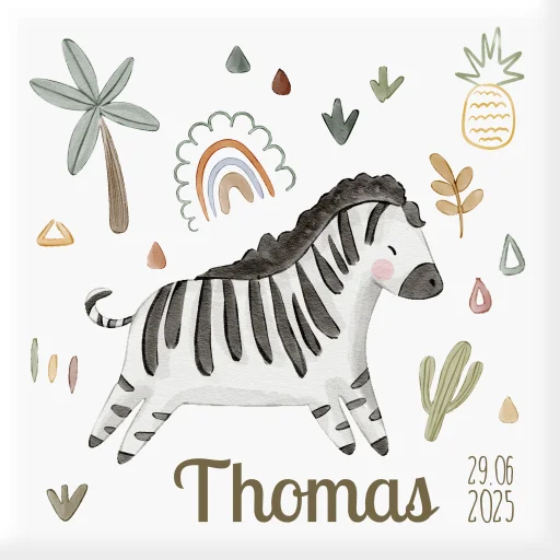 Een vrolijk tegeltje voor jouw kindje of als kraamcadeau. De tegel heeft een witte achtergrond met daarop verschillende vrolijke illustraties. In het midden zie je een schattige zebra. Onder de zebra zie je de naam en geboortedatum.