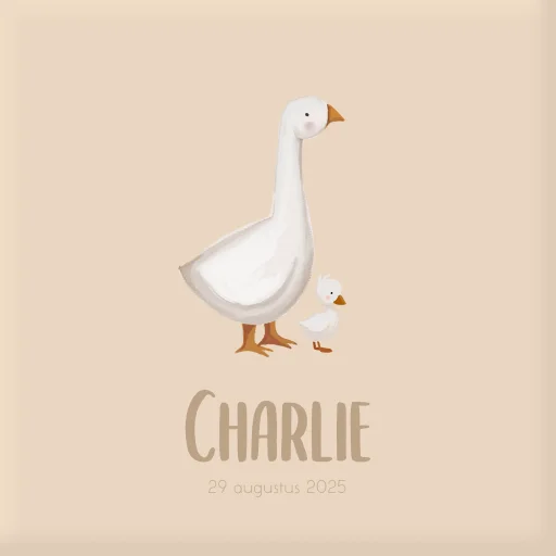Een lief en vrolijk geboortetegeltje voor jezelf of als kraamcadeau. De tegel heeft een beige achtergrond met daarop een lieve illustratie van twee gansjes. Onder de gansjes is er ruimte voor de naam en geboortedatum.