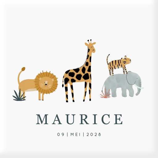 Een stoer geboortetegeltje voor jouw kindje. Het tegeltje heeft een witte achtergrond met daarop verschillende jungledieren. Daaronder lees je de naam en geboortedatum. Pas het ontwerp naar wens aan in onze online editor.