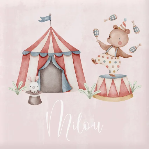 Vrolijk geboortetegeltje met roze achtergrond. Op het tegeltje zie je illustraties in circusthema met een beertje en konijntje. Onder de illustraties is er ruimte voor de naam van het kindje.