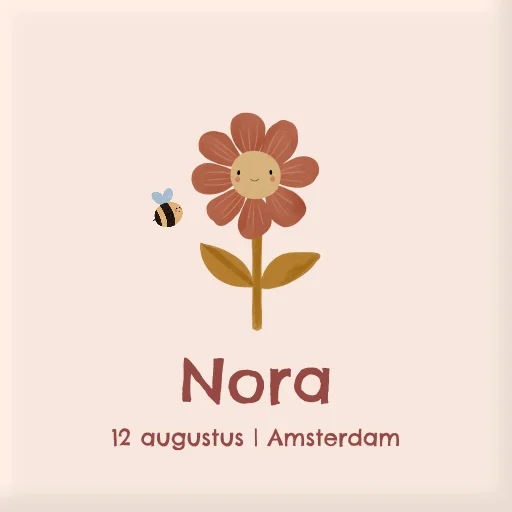 Wat een schattig geboortetegeltje! Op het tegeltje staat een vrolijke bloem met daaronder de naam van het kindje. Pas de tekst naar wens aan.