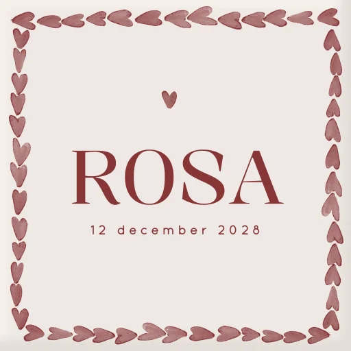 Een hip en stijlvol geboortetegeltje voor juow kindje. Het tegeltje heeft een lichte achtergrond met daarop een hartjes patroon als kader. In het midden is de naam en geboortedatum te lezen. Pas het ontwerp naar wens aan in onze online editor.