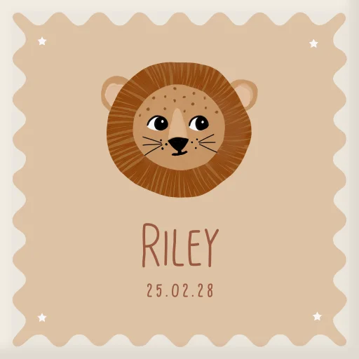 Een geboortetegeltje voor jouw kindje of als kraamcadeau. De tegel heeft een beige achtergrond met daarop een leeuwtje. Op de tegel staat de naam van jullie kindje en de geboortedatum. Pas de tegel zelf volledig naar wens aan.