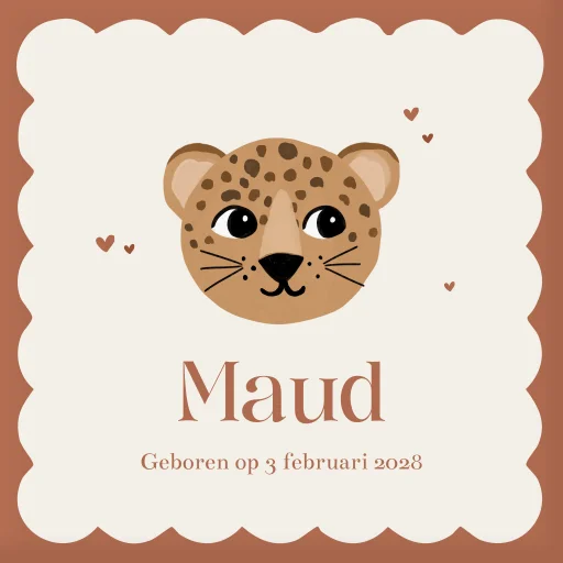 Een lief geboortetegeltje voor jouw kindje of als kraamcadeau. De tegel heeft een vrolijk patroon met in het midden een schattig pantertje met hartjes. Op de tegel staat de naam van jullie kindje en de geboortedatum. Pas de tegel zelf volledig naar wens aan.
