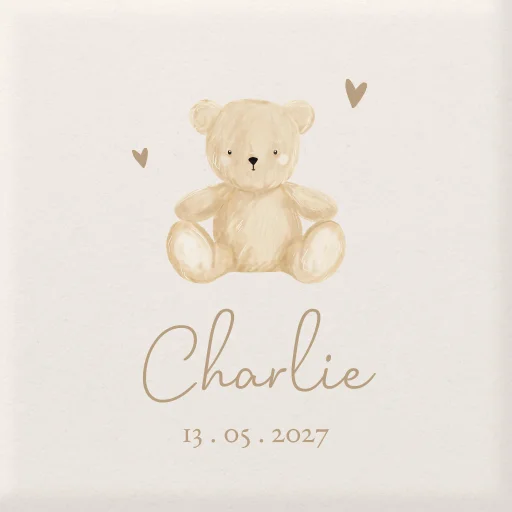 Een lief geboortetegeltje voor jouw kindje of als kraamcadeau. De tegel heeft een beige achtergrond met daarop een lief teddybeertje. Op de tegel staat de naam van jullie kindje en de geboortedatum. Pas de tegel zelf volledig naar wens aan.