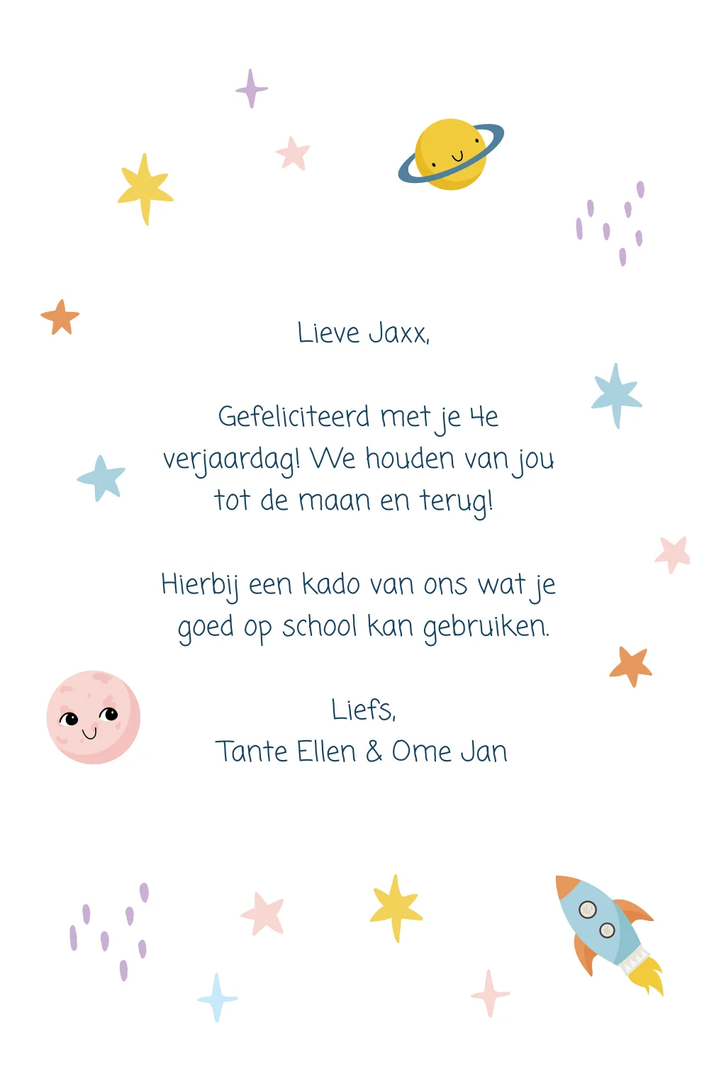 Dit is een vrolijke wenskaart met de illustraties van planeten en sterren. De kaart kan helemaal naar wens aangepast worden in onze online opmaaktool. Leuk in combinatie met de bijpassende cadeaudoos!
