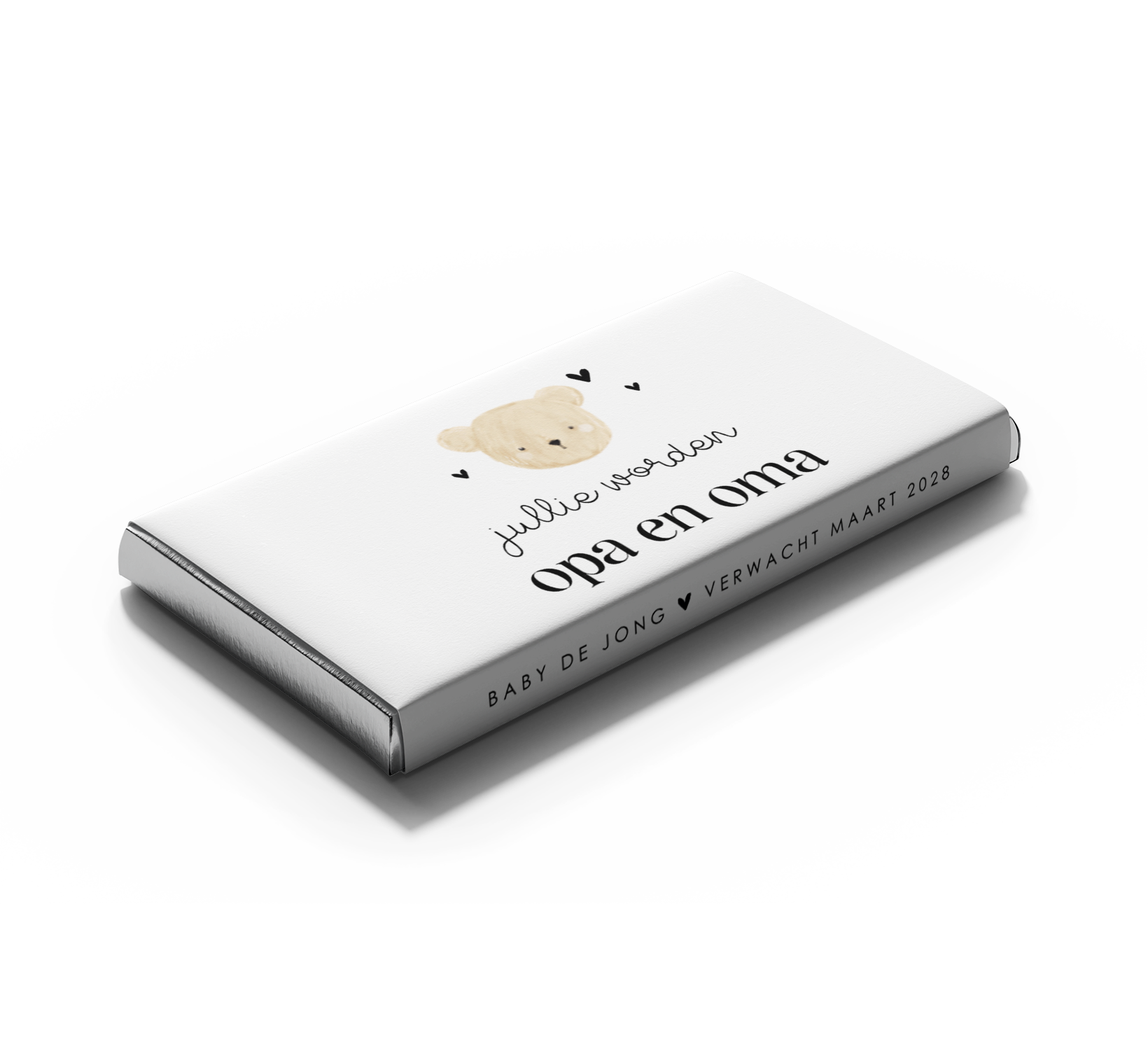 Maak jullie zwangerschap op een unieke manier bekend met deze gepersonaliseerde chocoladewikkel! De wikkel heeft de illustratie van een lief berenhoofd en hartjes. Daaronder staat de tekst "jullie worden opa en oma" en de uitgerekende datum. Kies je smaak Tony Chocolonely en pas de wikkel volledig naar wens aan in onze online editor.
