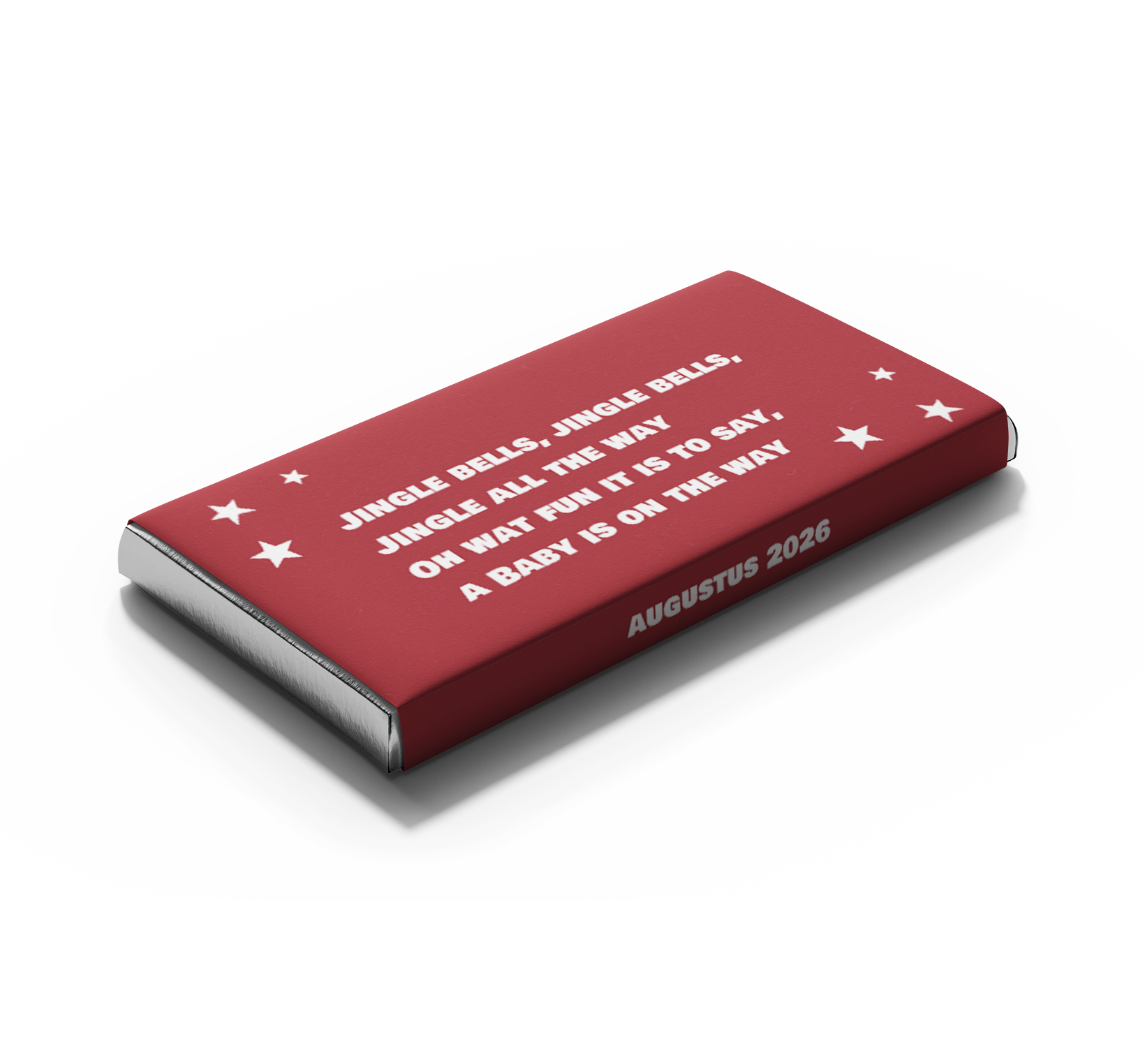 Kondig jullie zwangerschap op een unieke manier aan met een gepersonaliseerde chocoladewikkel. Deze wikkel heeft een bordeaux achtergrondkleur met witte tekst en sterretjes. Voeg de uitgerekende datum toe en verras vrienden of familie. Kies een smaak Tony Chocolonely en pas de wikkel helemaal naar wens aan in onze online editor.