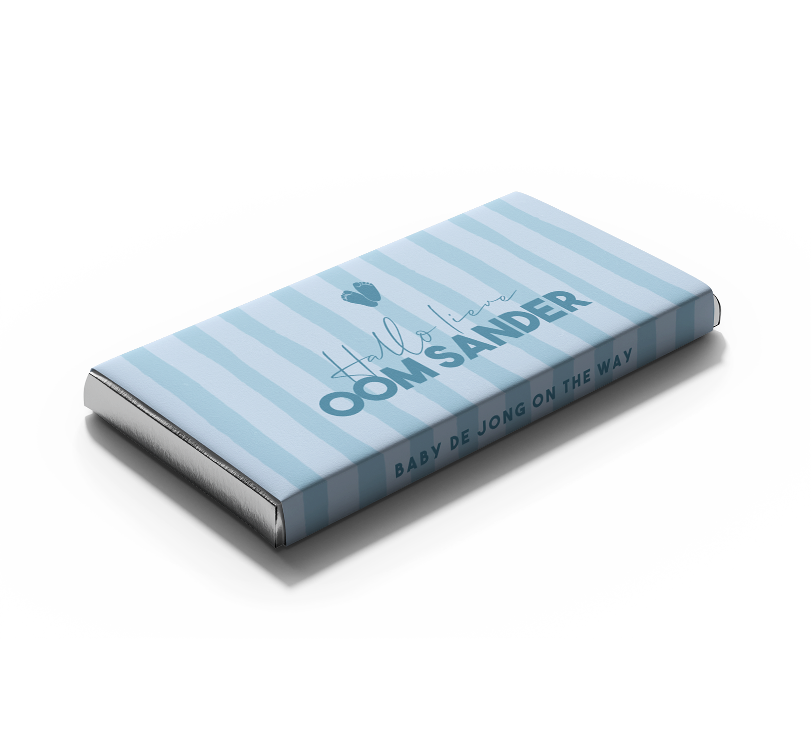 Kondig jullie zwangerschap op een unieke manier aan met deze kleurrijke wikkel voor een chocoladereep! De wikkel heeft twee verschillende blauwe strepen en de tekst 'Hallo lieve oom Sander'. Boven de tekst staat een lief blauw hartje.