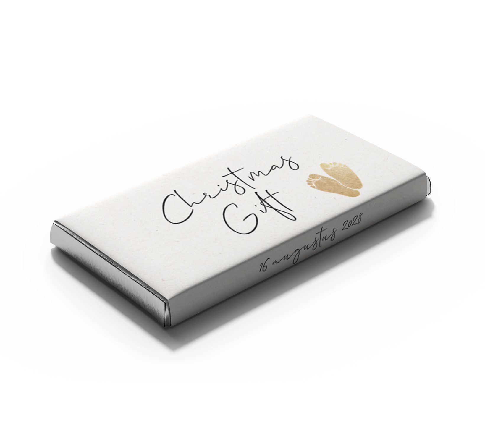 Maak jullie zwangerschap op een unieke manier bekend met deze gepersonaliseerde chocoladewikkel! De wikkel heeft de illustratie van een gouden voetjes. Daarboven staat de tekst "Christmas gift" en de uitgerekende datum. Kies je smaak Tony Chocolonely en pas de wikkel volledig naar wens aan in onze online editor.