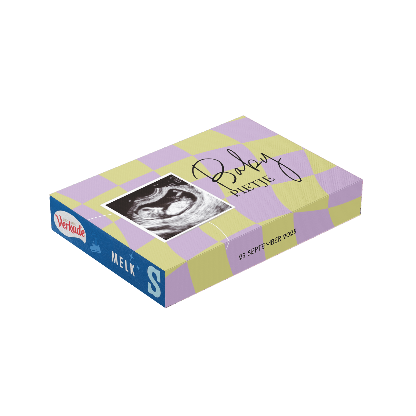 Kondig jullie zwangerschap op een unieke manier aan met een gepersonaliseerde chocoladewikkel. Voeg je echo-foto toe, samen met de uitgerekende datum. Kies een smaak chocoladeletter van Droste en pas de wikkel helemaal naar wens aan in onze online editor.