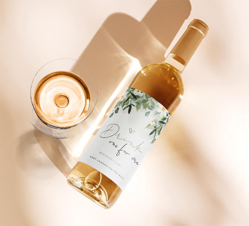 Kondig de zwangerschap aan op een originele en hippe manier door jouw eigen etiket op een wijnfles te plakken. Op dit etiket staat een leuke tekst die je zelf naar wens kunt aanpassen in onze online editor. De mooie illustraties van witte bloemen maken het etiket helemaal af. Op één vel staan 5 wijnetiketten.