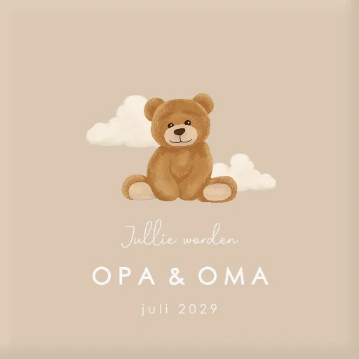 Deel jouw babynieuwtje met een mooi tegeltje. Op het tegeltje staat een schattige illustratie van een zittend beertje. Je leest op het tegeltje: 'Jullie worden opa & oma'. Onder de tekst is er ruimte voor de uitgerekende datum. Pas het tegeltje naar wens aan in onze online editor.