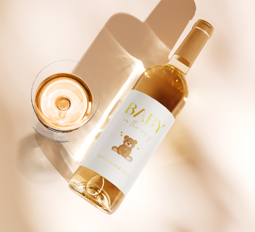 Kondig de zwangerschap aan op een originele manier door jouw eigen etiket op een wijnfles te plakken. Op dit etiket staat een lief zittend beertje met hartjes er omheen. De tekst die je zelf naar wens kunt aanpassen in onze online editor is in goudfolie te zien. Op één vel staan 5 wijnetiketten.