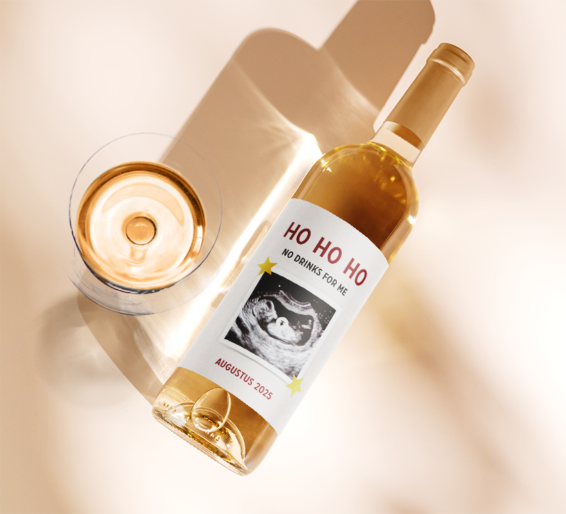 Kondig jullie zwangerschap op een unieke manier aan met dit mooie wijnetiket. Het etiket heeft een beige achtergrond en gouden sterren. Voeg de uitgerekende datum toe en verras je vrienden en familie. Pas het etiket volledig naar wens aan in onze online opmaaktool.