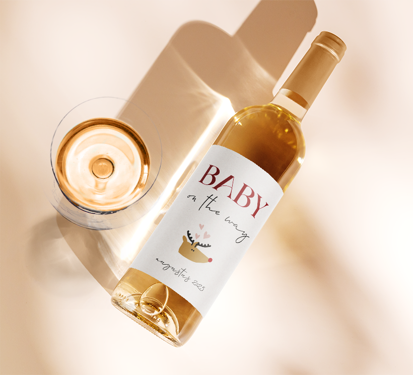Kondig jullie zwangerschap op een unieke manier aan met dit mooie wijnetiket. Het etiket heeft een beige achtergrond met de illustratie van een rendier en hartjes. Voeg de uitgerekende datum toe en verras je vrienden en familie. Pas het etiket volledig naar wens aan in onze online opmaaktool.