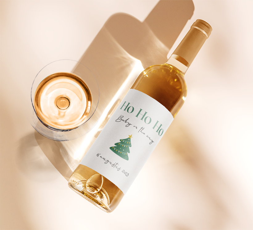 Kondig jullie zwangerschap op een unieke manier aan met dit mooie wijnetiket. Het etiket heeft een lichte achtergrond met de illustratie van een kerstboom. Voeg de uitgerekende datum toe en verras je vrienden en familie. Pas het etiket volledig naar wens aan in onze online opmaaktool.